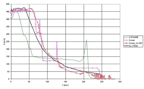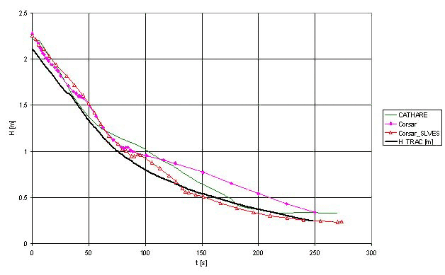в сравнении с расчетами по кодам CORSAR (НИТИ, 2 версии модели бака) и CATHARE (Франция).